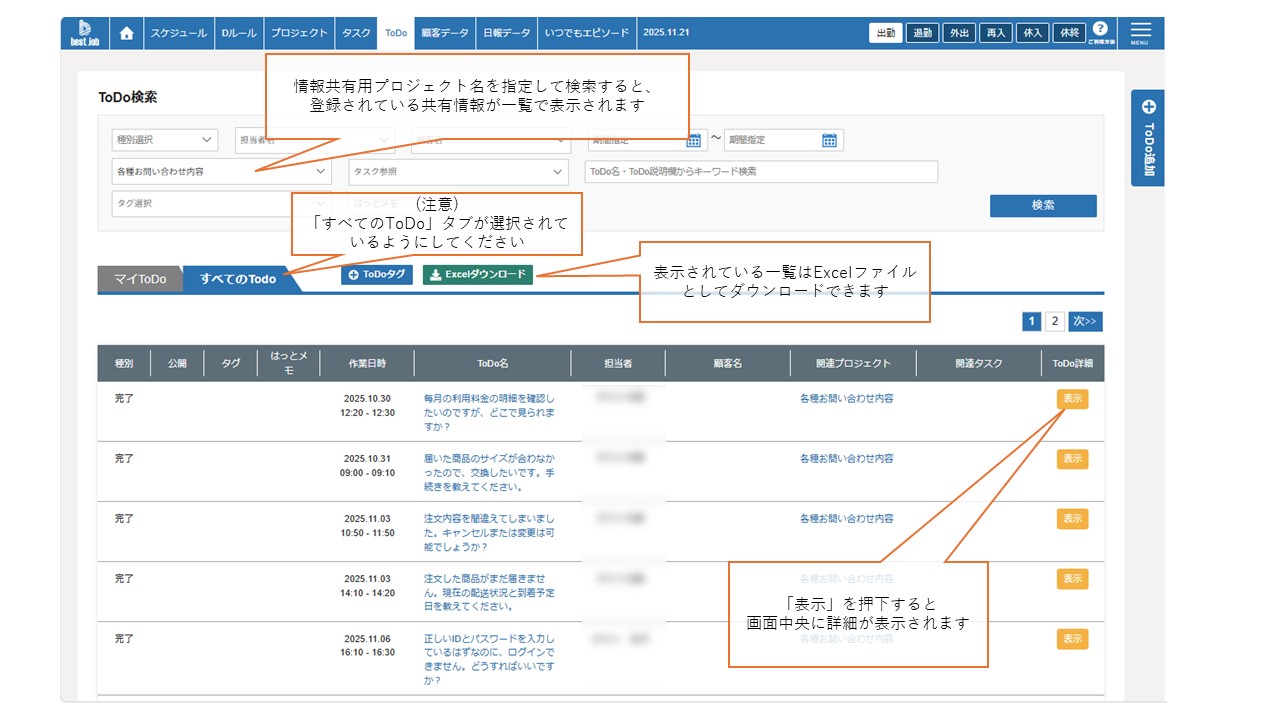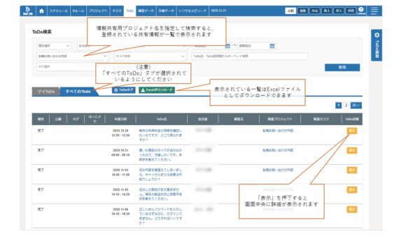●ToDoメニューの「すべてのToDo」タブを開き、情報共有用プロジェクトを指定してToDoを検索すると、登録されたToDo(共有情報)が一覧で表示されます