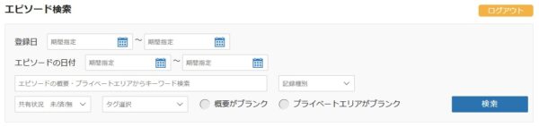 | フリーワード検索 | エピソードの概要とプライベートエリアの内容から指定の文言で絞り込む事ができます |