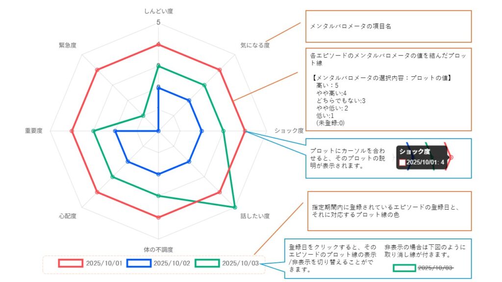 メンタルバロメータ集計では、登録されているエピソードのメンタルバロメータを集計し、レーダーチャート化して確認する事ができます。