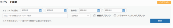 4,PDFの一括出力対象を指定したい場合は、エピソード検索の項目から、日付や登録日、キーワードなどを入力し、検索をクリックします。